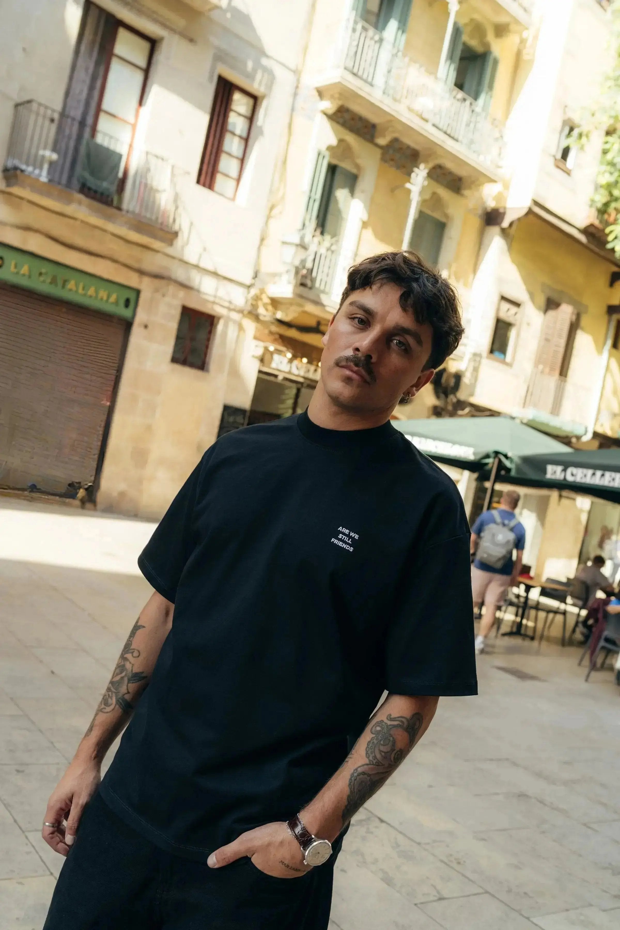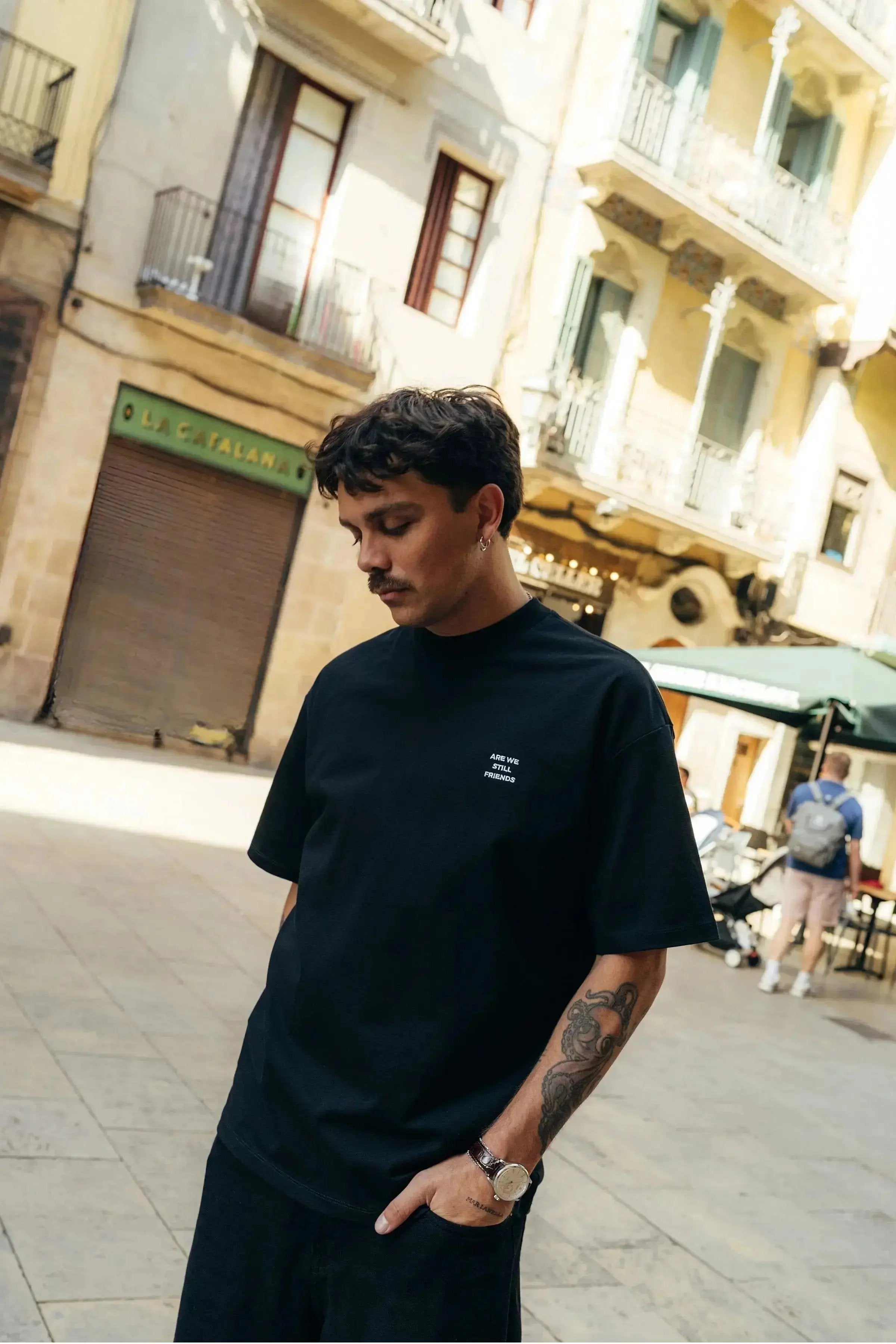 The Tee Question Embroidered in midnight black features the Are We Still Friends branding embroidered on both the front and the back.