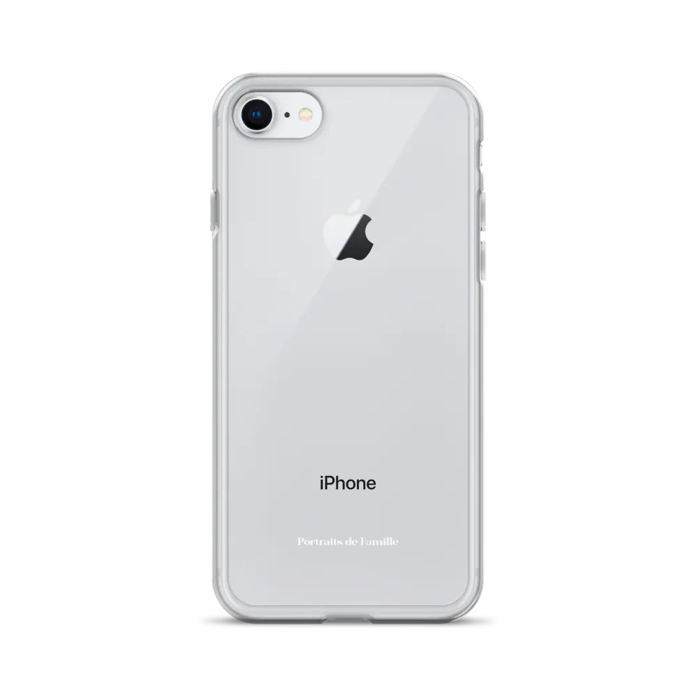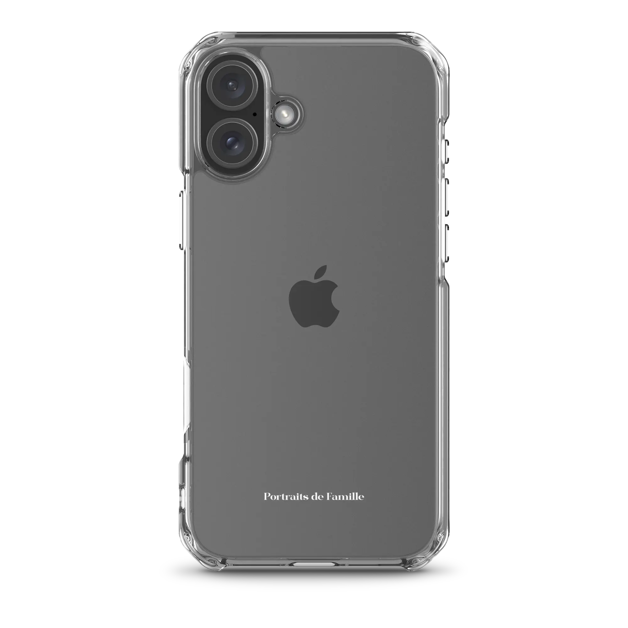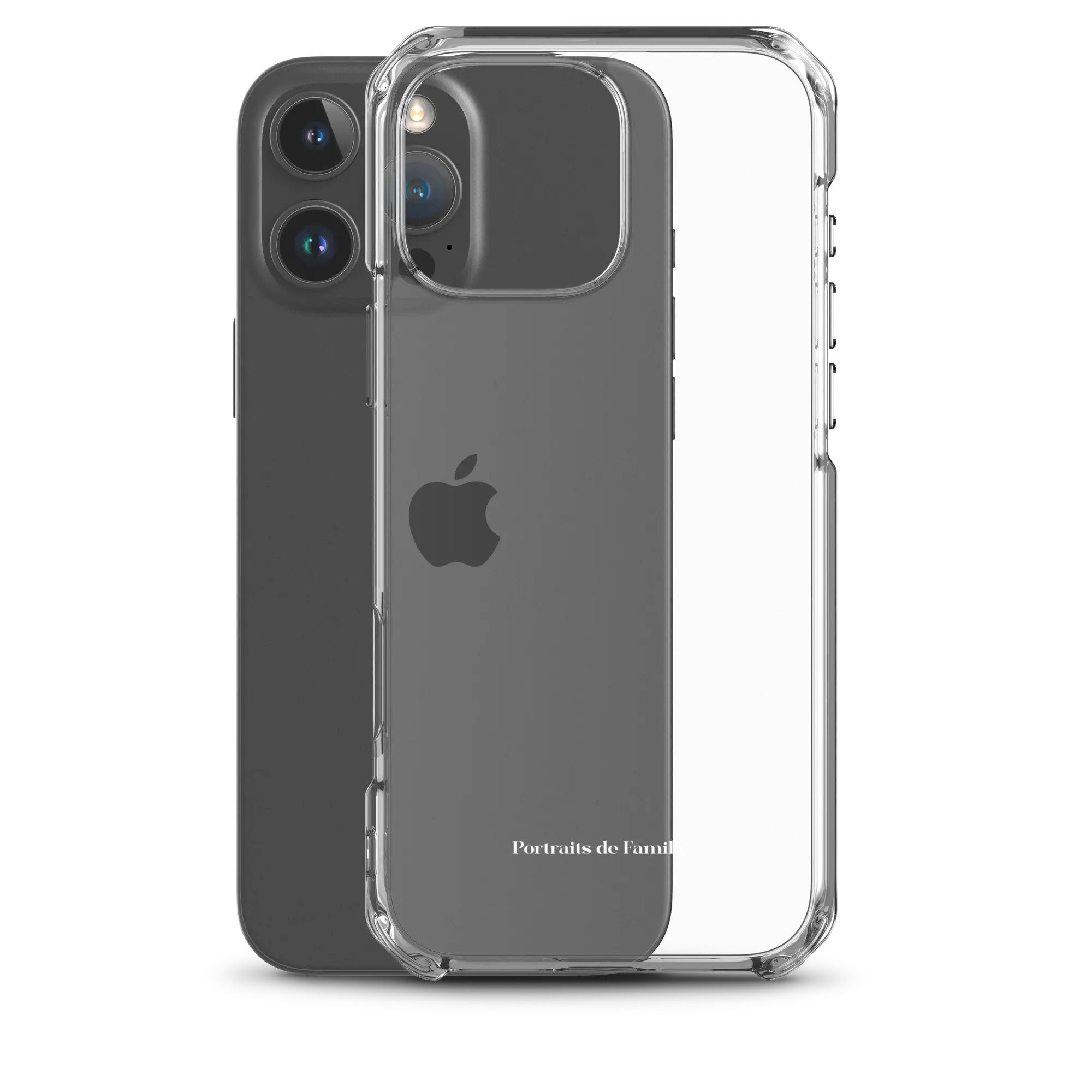 The iPhone Clear Case features the Portraits de Famille logo in white.