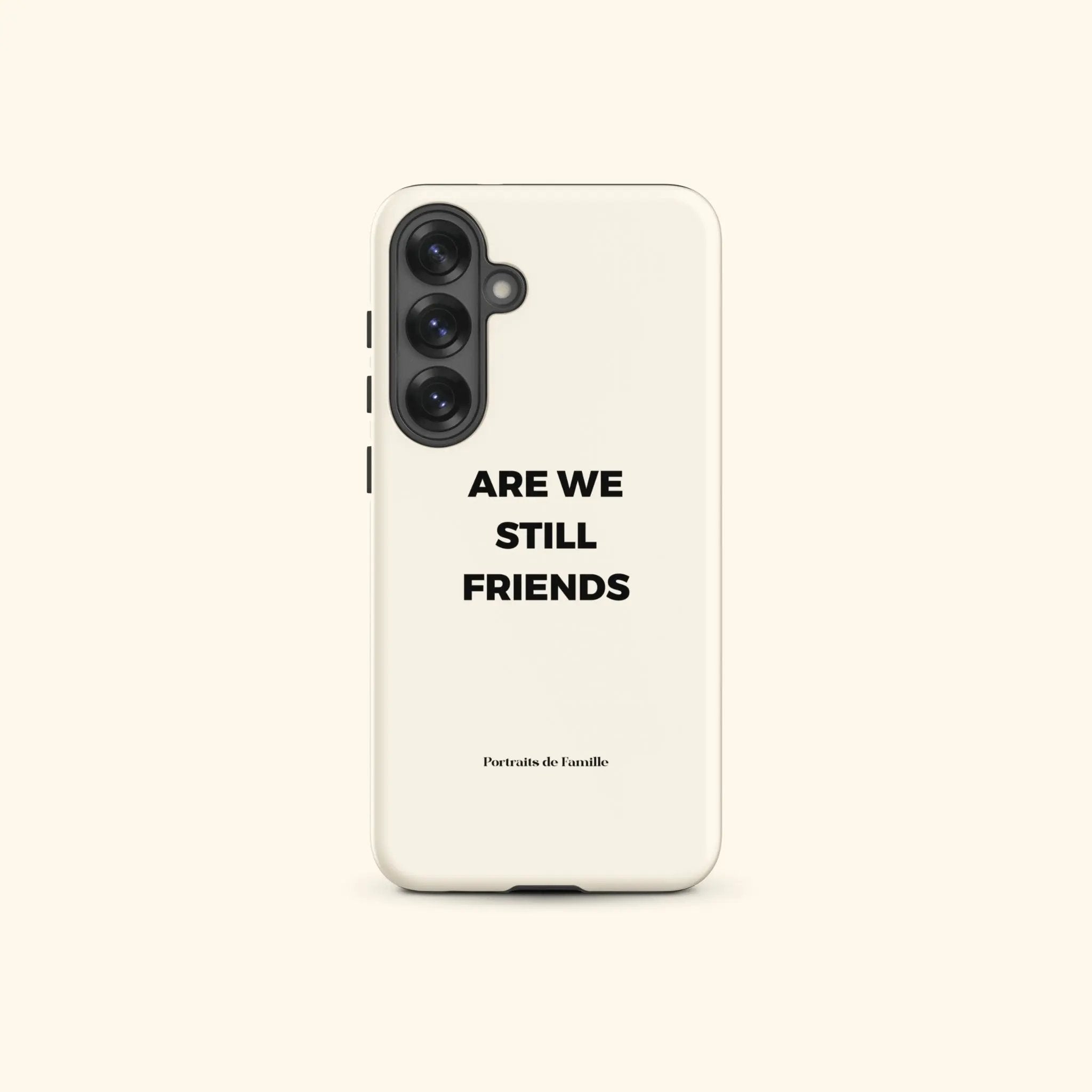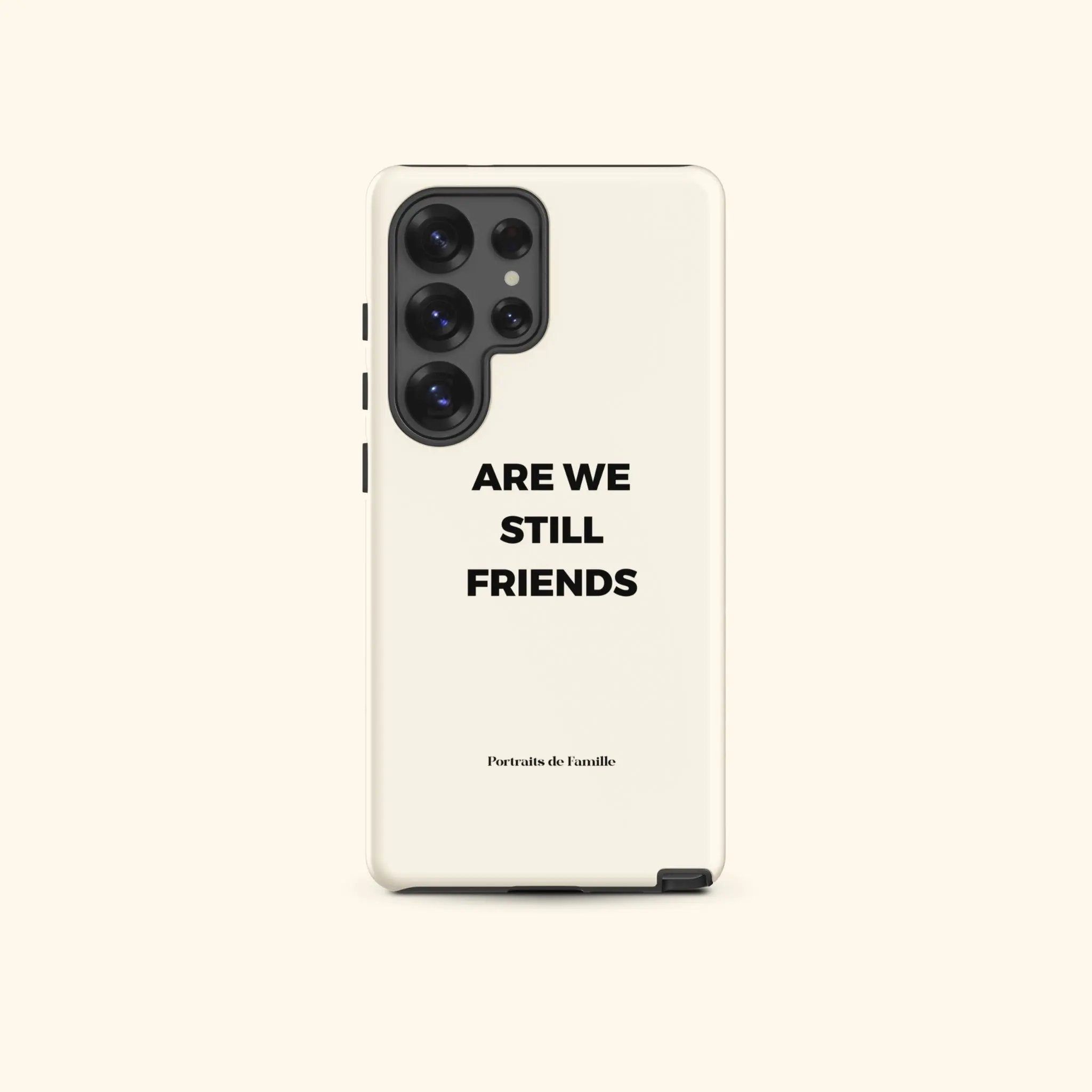 The Samsung Tough Case features the Are We Still Friends branding and the Portraits de Famille