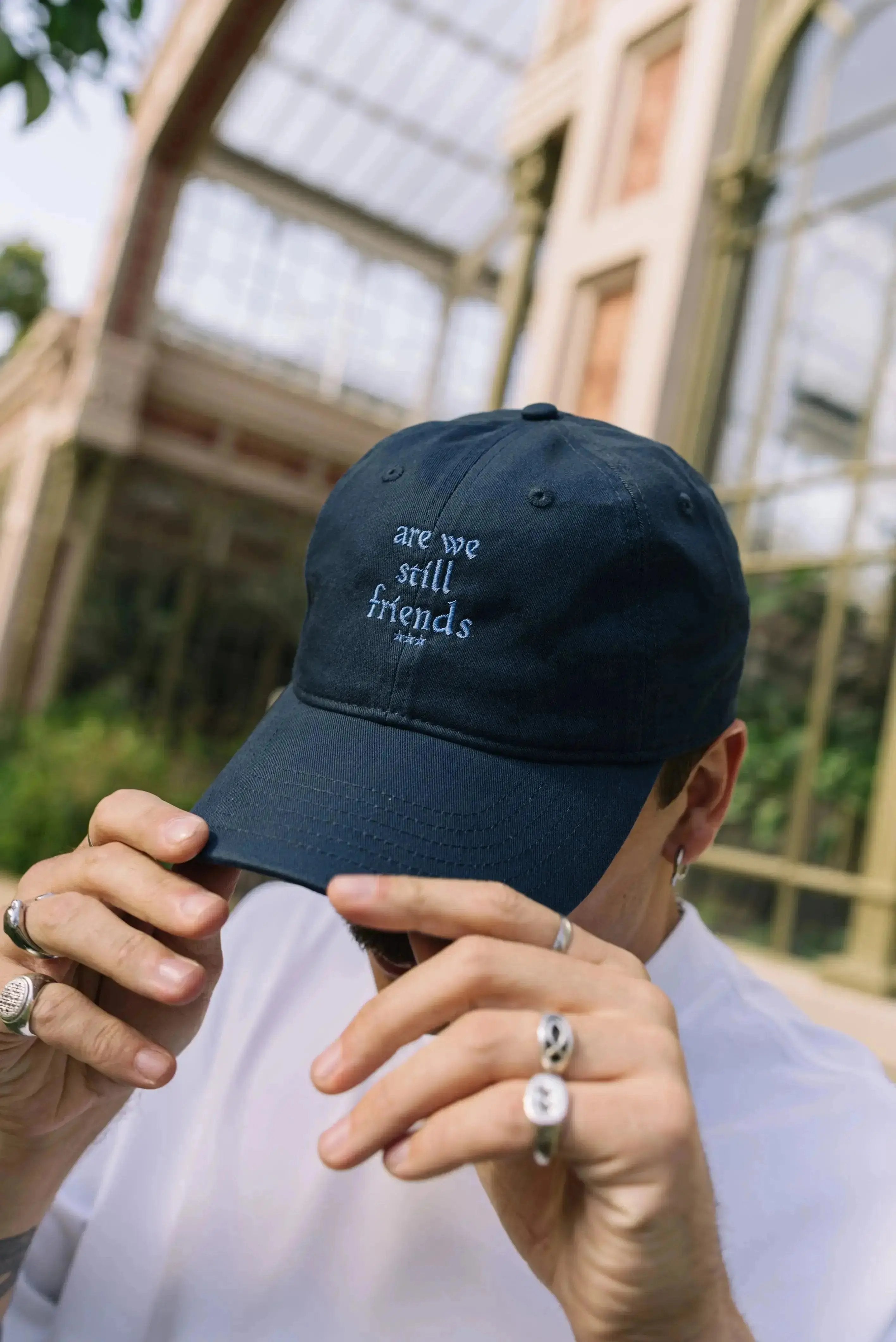 The Cap Amigos in pacific blue is part of the "DAR VIDA" capsule in collaboration with Caitlin Flood-Molyneux. It features the Amigos artwork embroidered on the front.