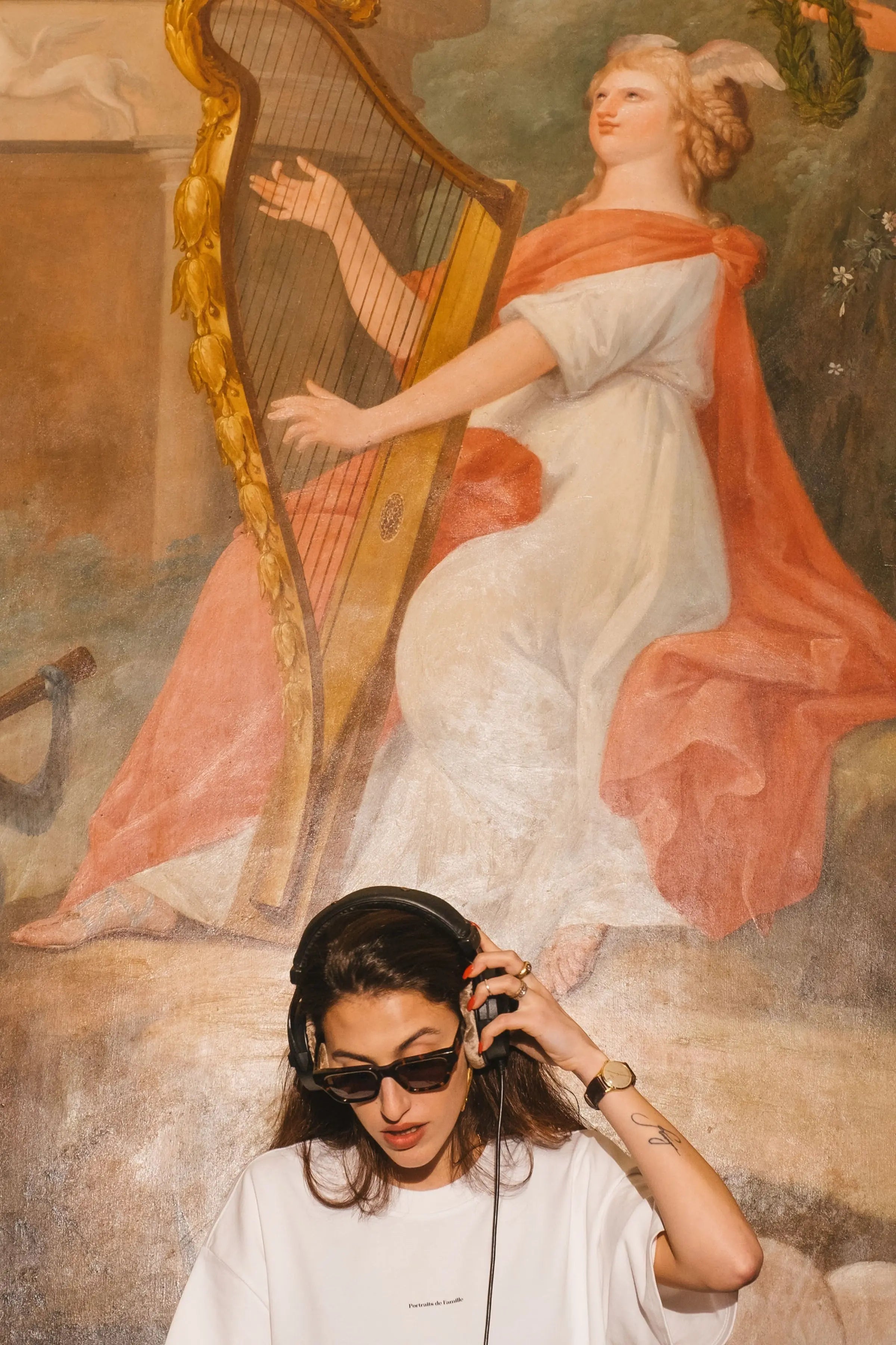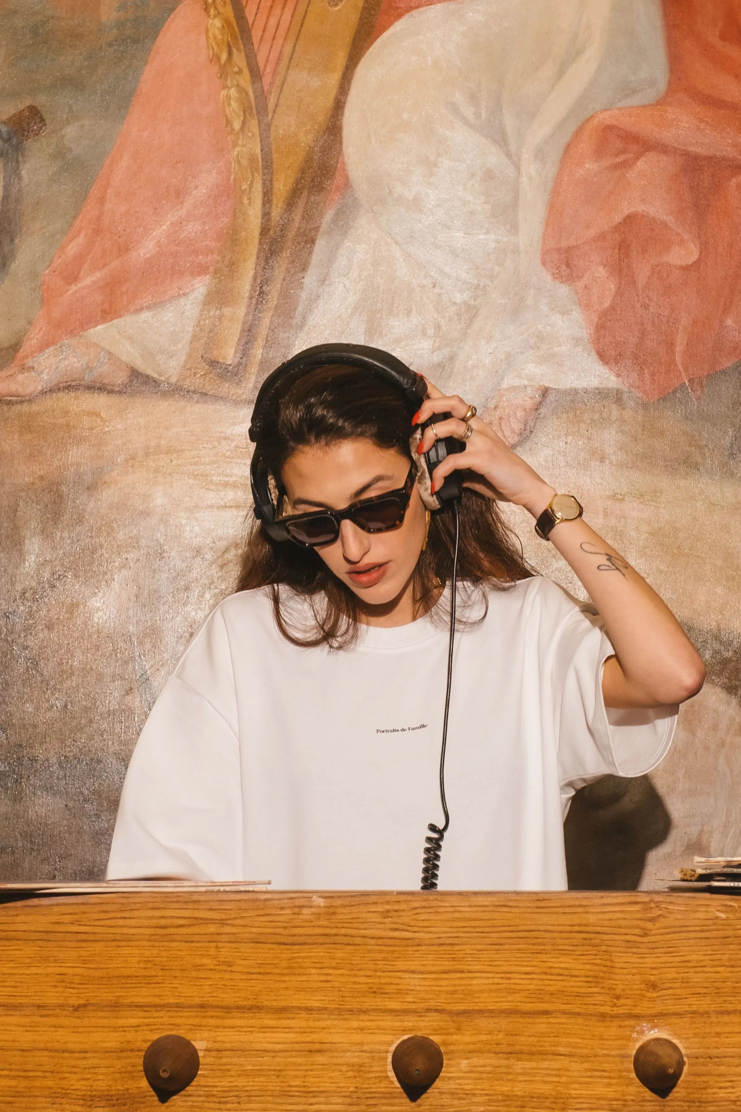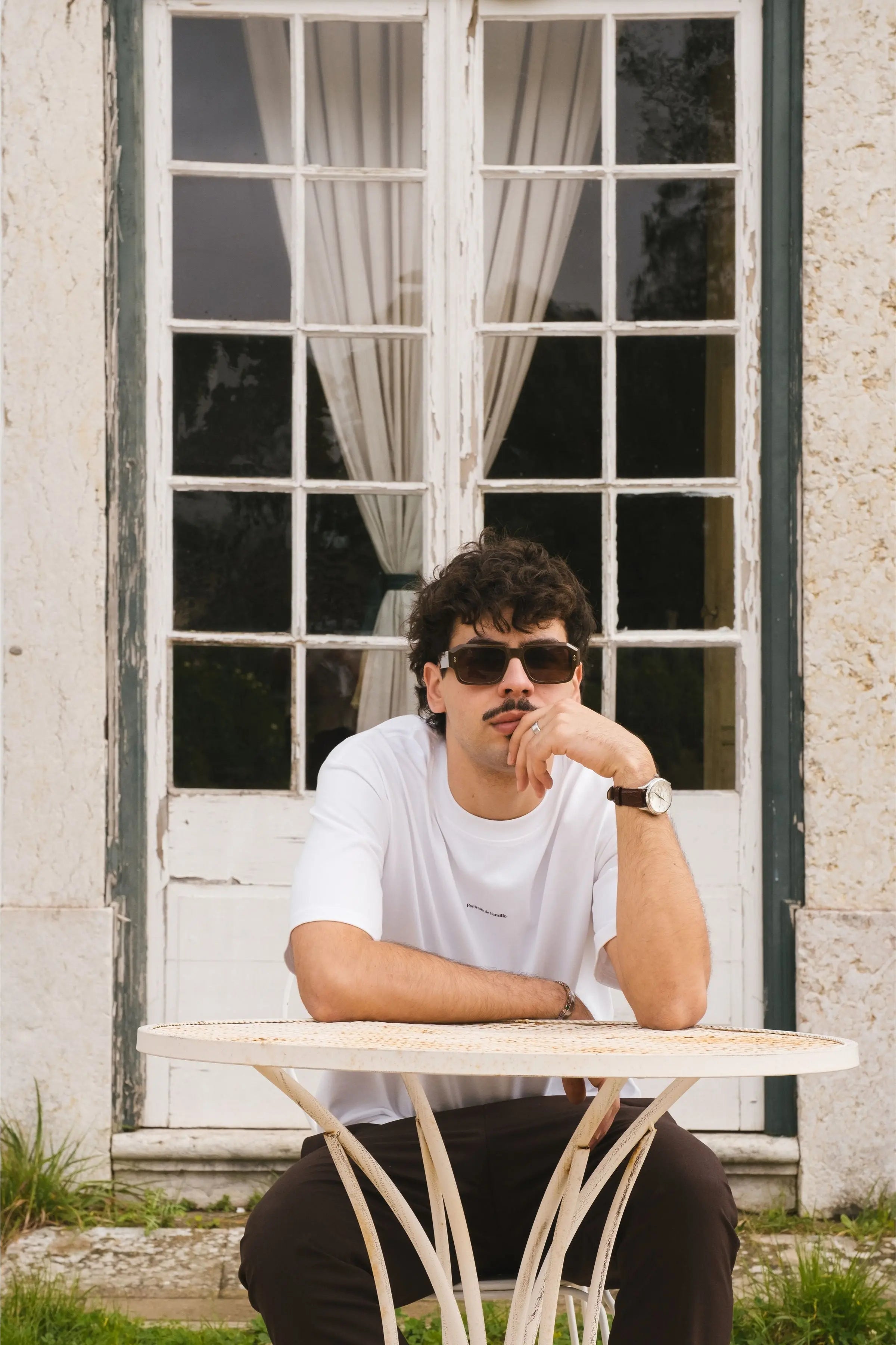 The Tee Logo in forest green features the logo on the front and the Portraits de Famille artwork on the back.